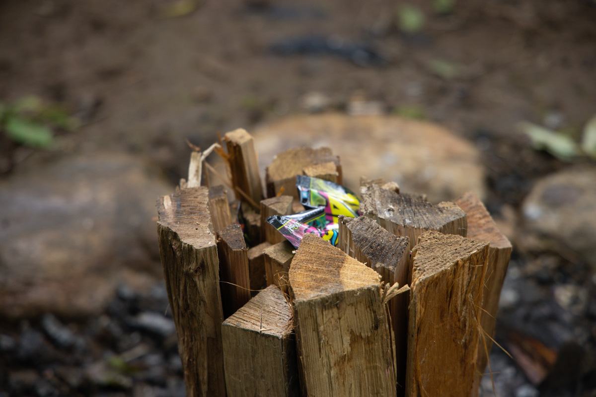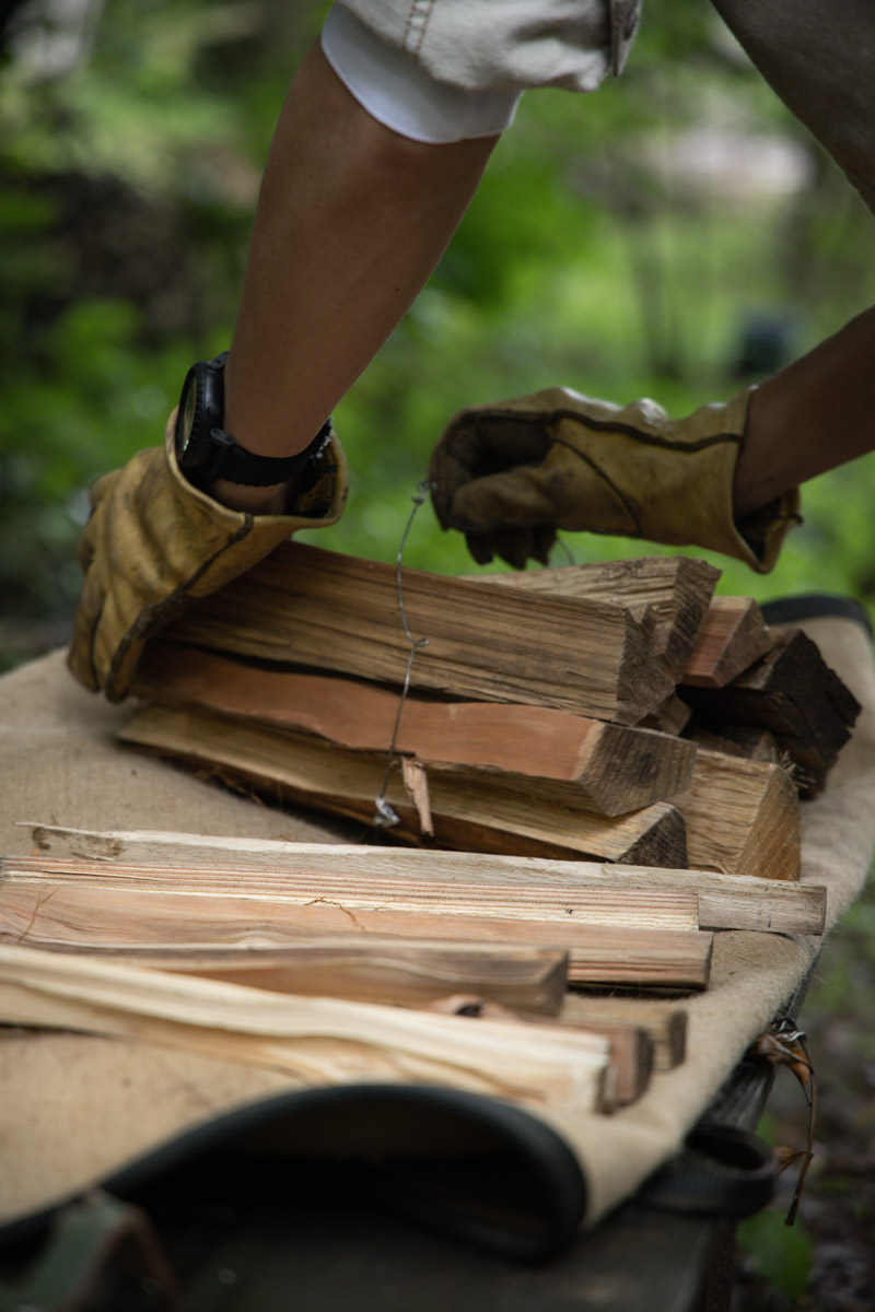 「薪を束にしワイヤーで縛り、縦に立て、ARTFIREを薪の間にいくつも仕込みます。そうすることで虹色の炎は縦に大きく燃え上がり、綺麗な虹色の焚き火が出来上がるはず」