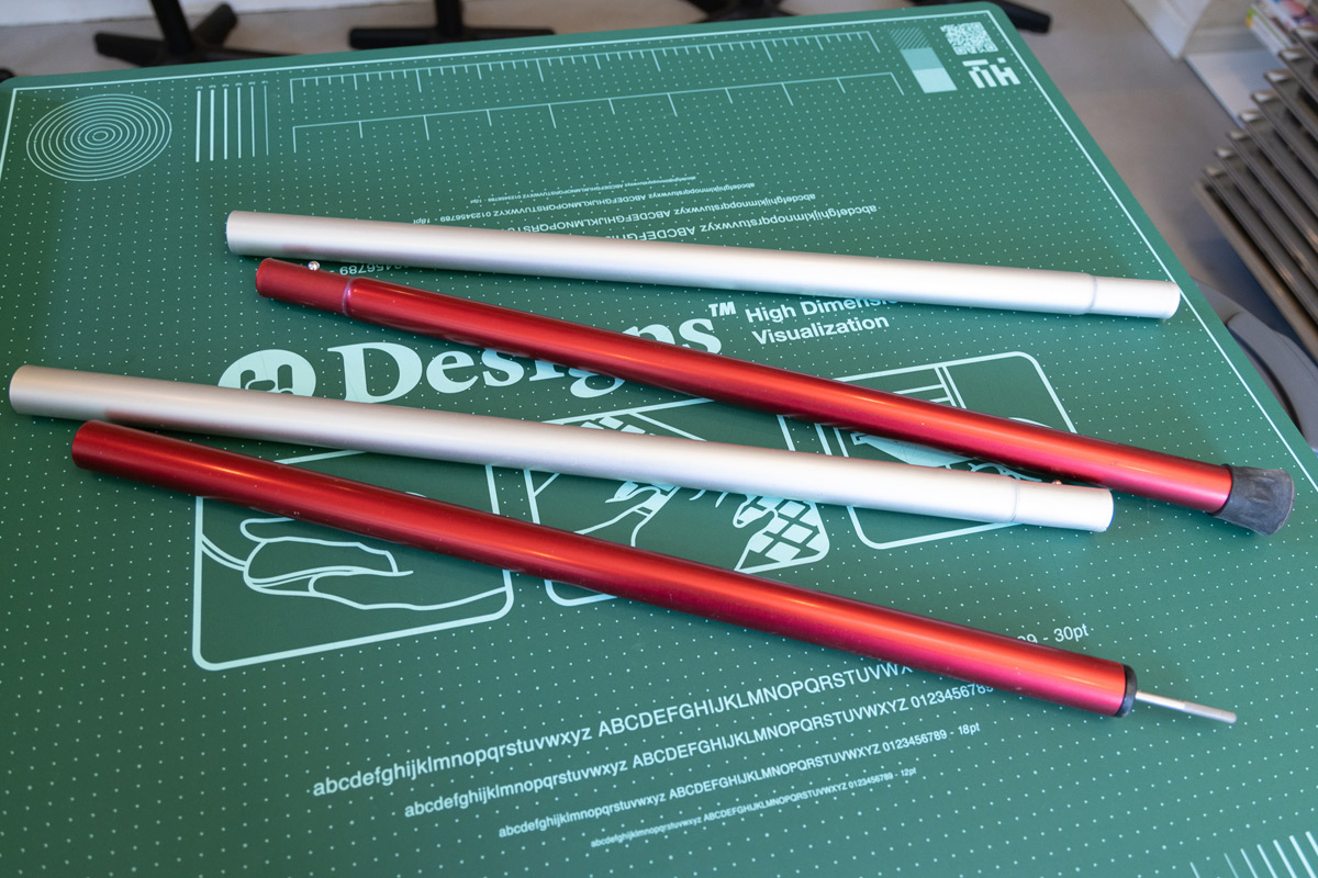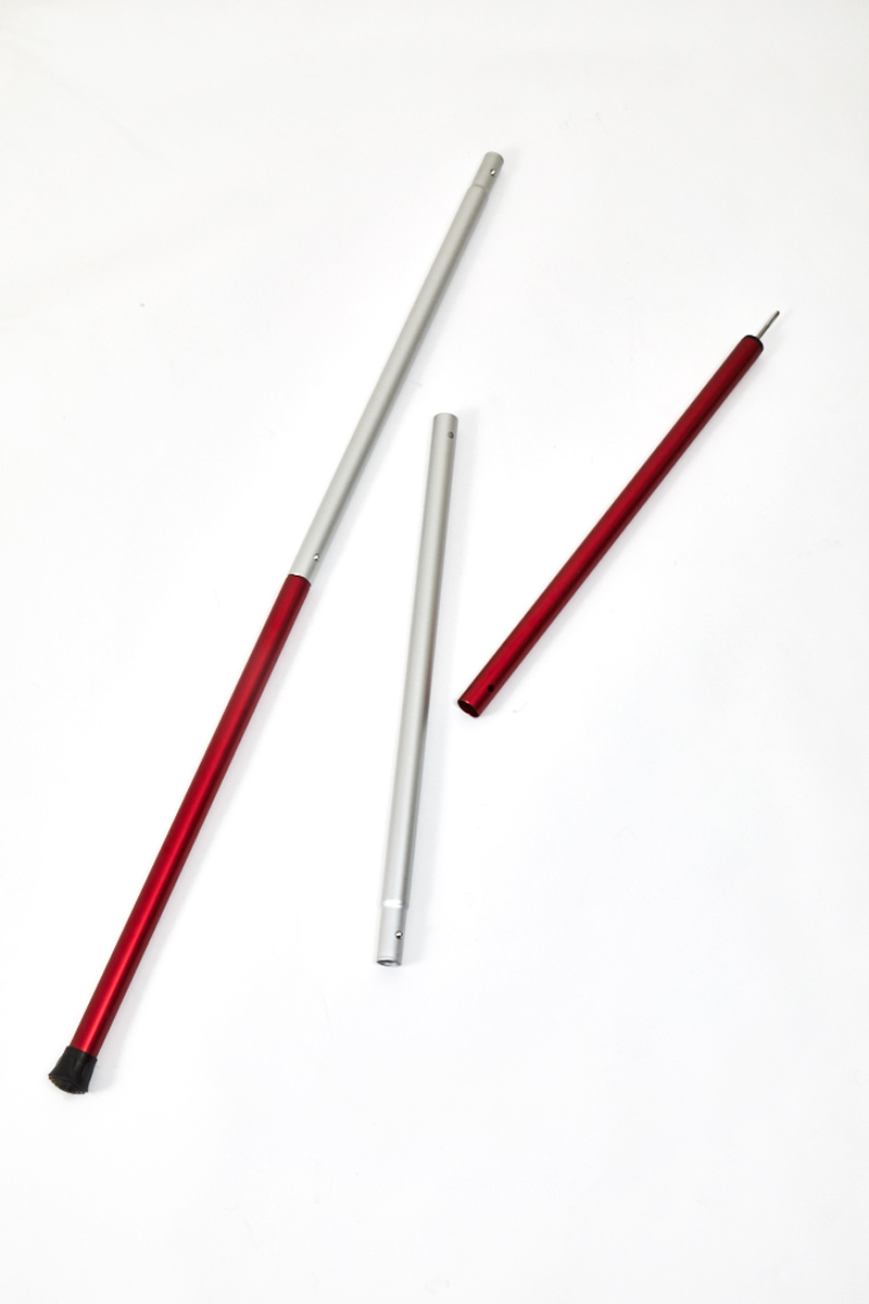 タープポールって差をつける場所がないので、なにかできないかなと考えた苦肉の策が、2色買って互い違いに使う。シルバーと赤のポールを買って、1本ずつ入れ替えて使っています。