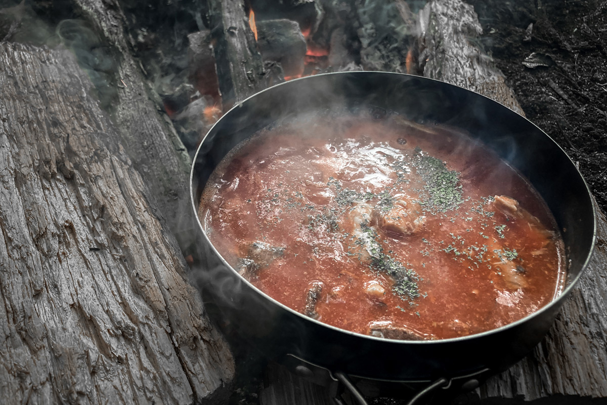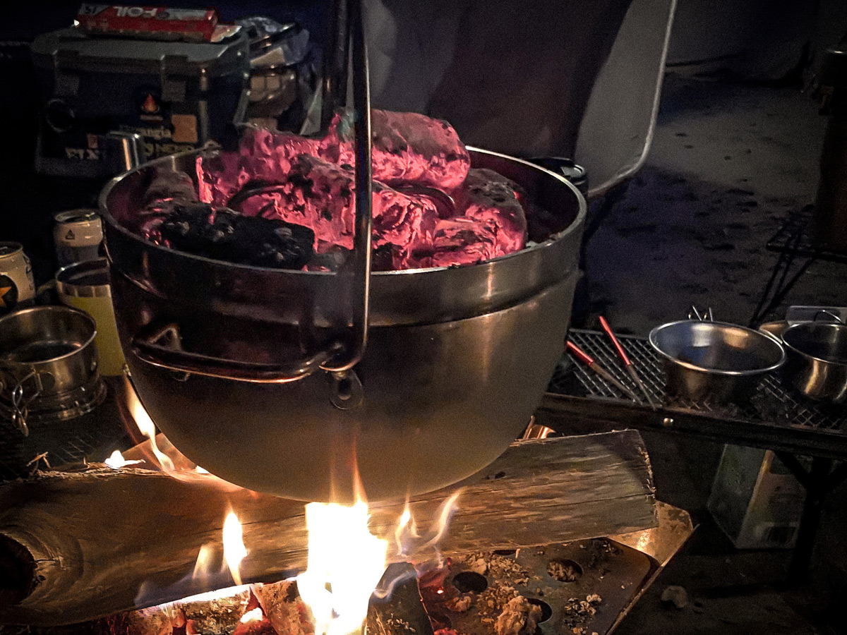 ダッチオーブンも焚き火の高火力で一気に温めます。