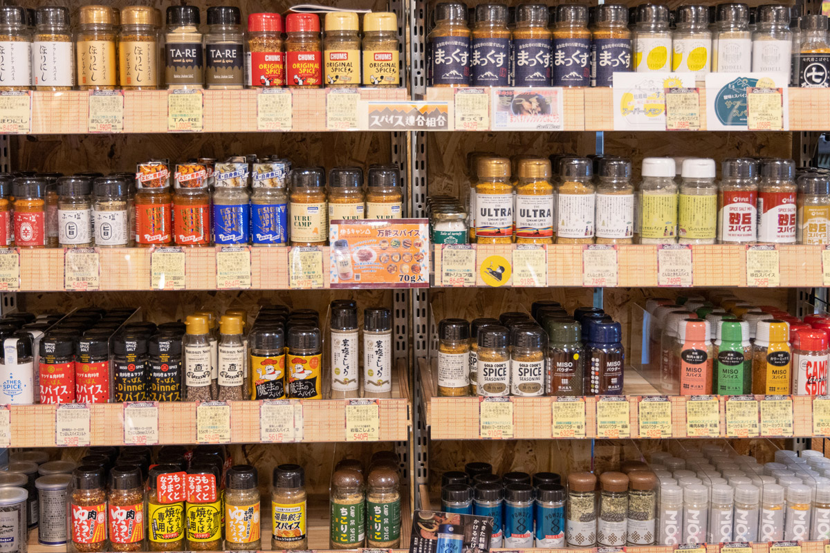 店先にはスパイスの自動販売機があり、店内に入ると左手にはキャンプで使えるスパイス、調味料、レトルト食品などがずらりと、中央から右側にかけてはいわゆるキャンプギアが陳列されている。