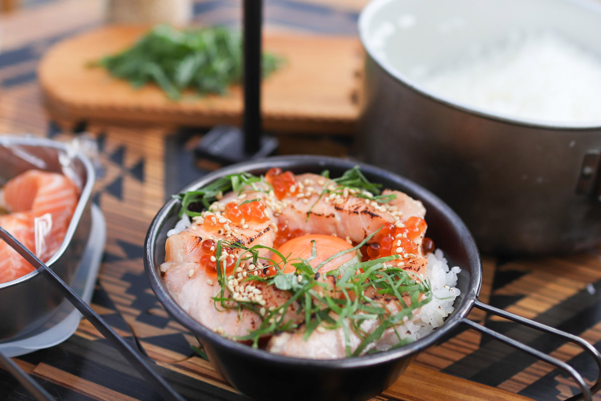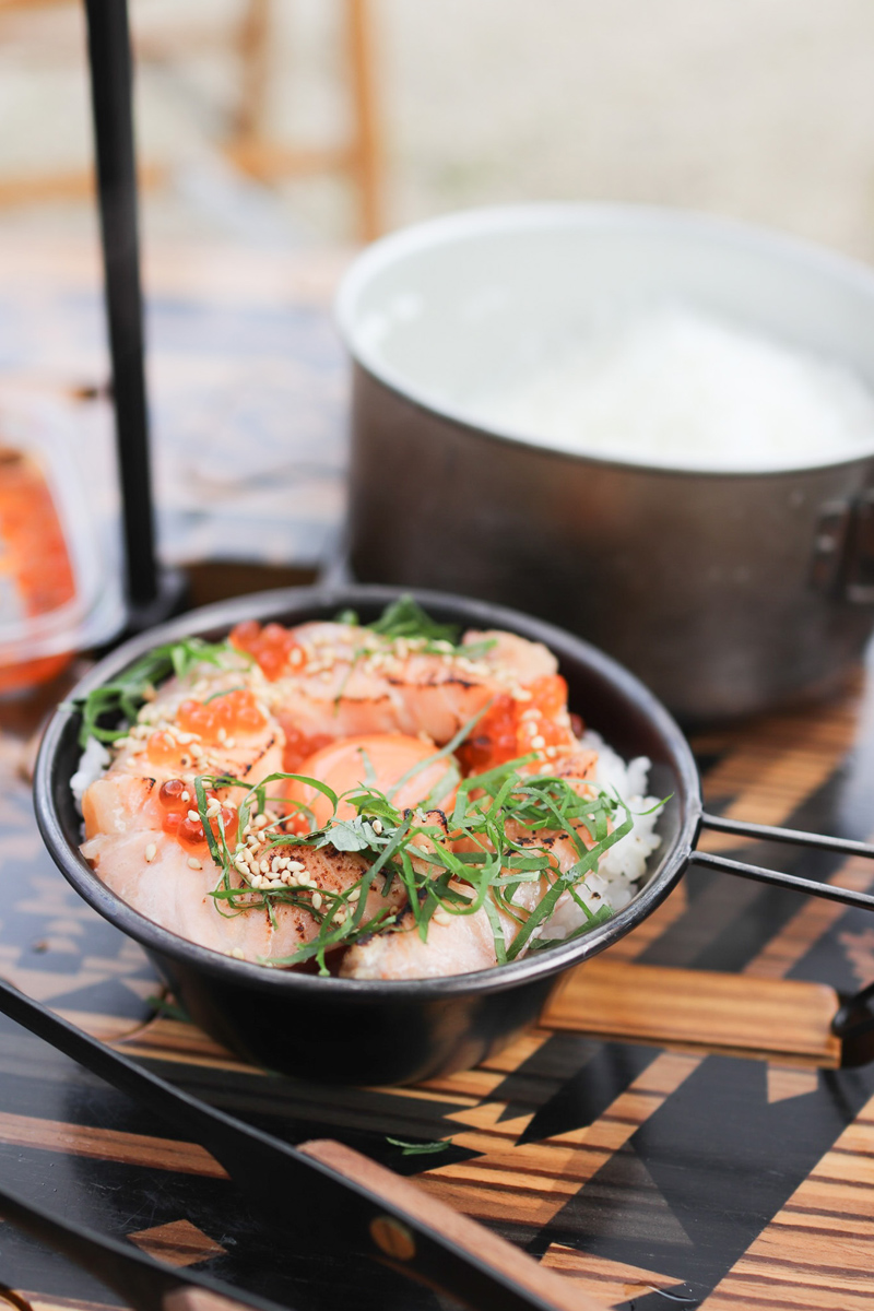 一品目のキャンプ飯は、「軽く炙るのがミソ!漬けサーモンの炙り丼」。