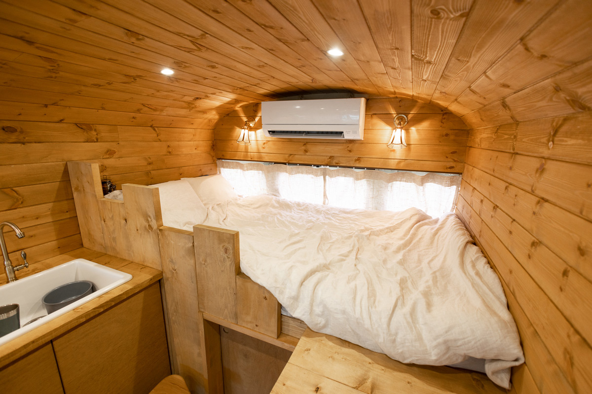 現在使っているカスタムスクールバス内装は見た目だけでなく、住居レベルの快適空間を作るため、バッテリーやエアコンなどにもこだわり、大型のソーラーパネルをルーフに取り付けるなど実験的な取り組みも行っています。さらに現在はバンのビルダーとして活動中。