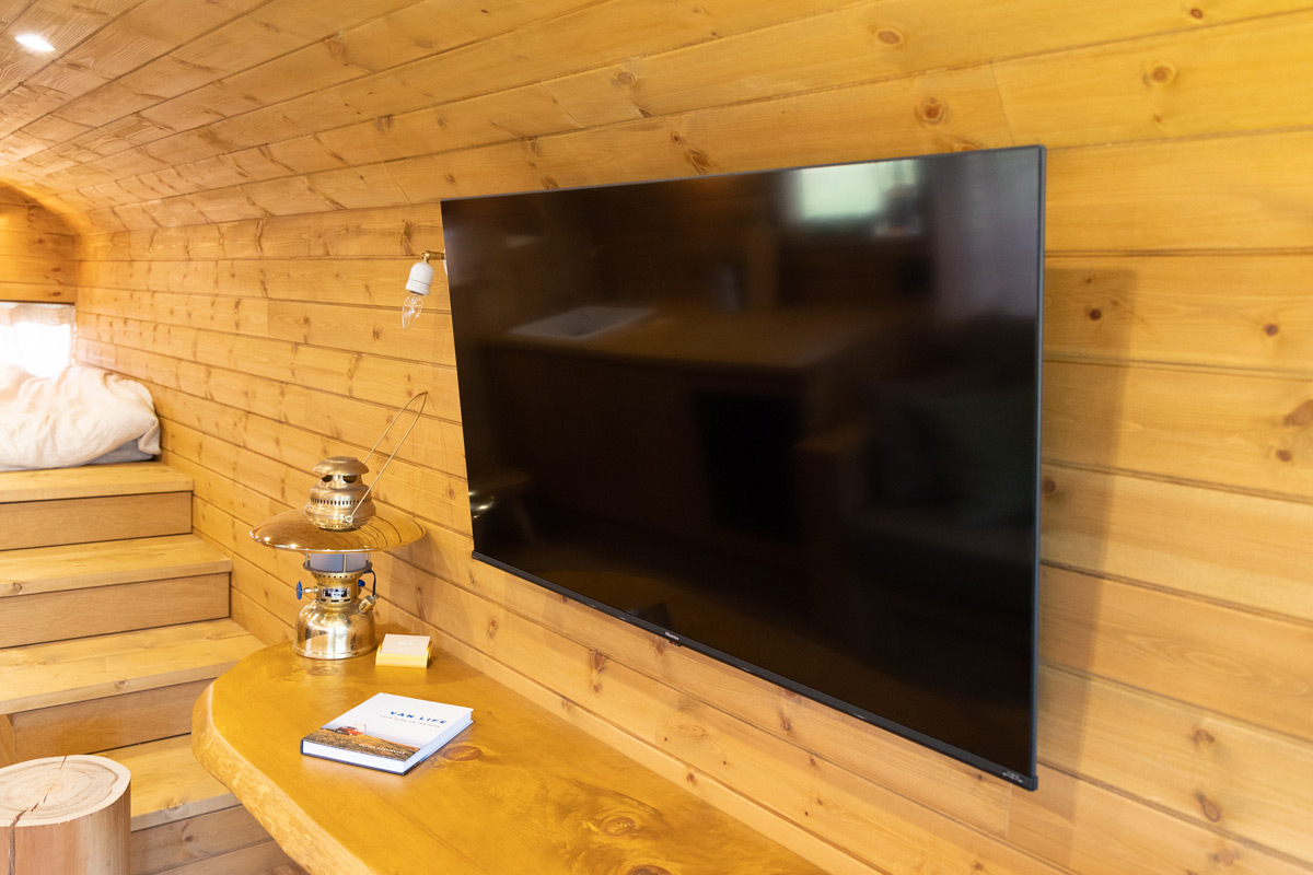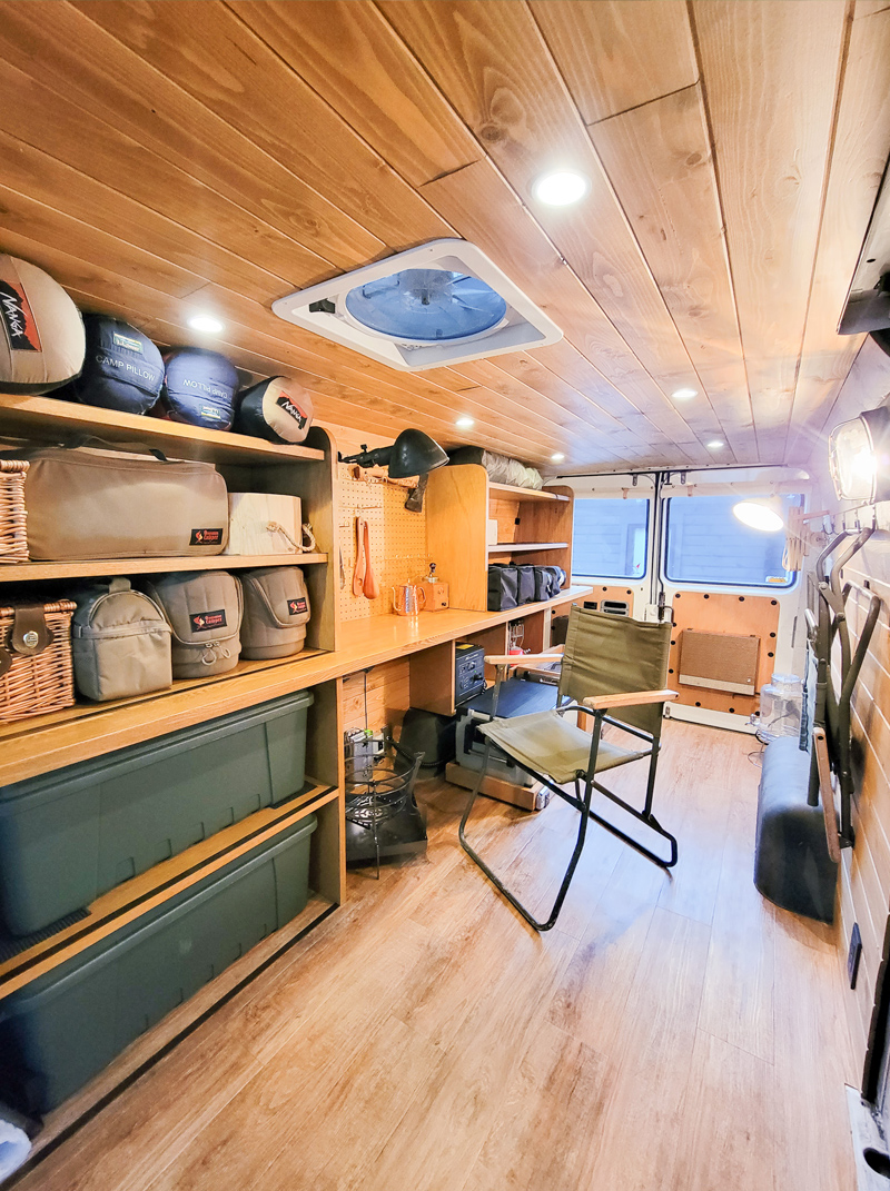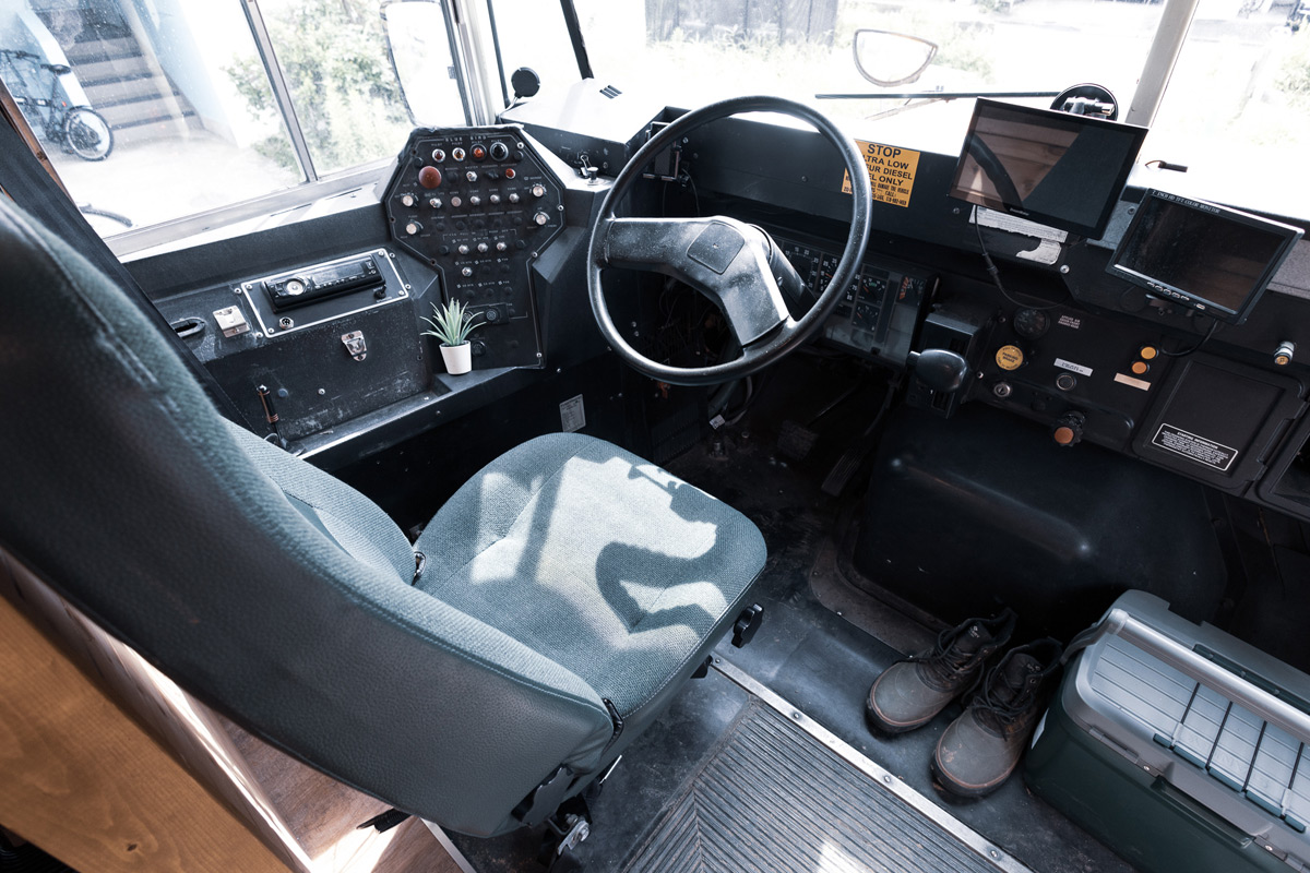キャンプギアの道具箱のような壁面棚、使い勝手の良いスライド式のキッチン、イギリス軍で使用されたローバーチェア、ヴィンテージのライト類、高音質のスピーカー、ガジェット好きな男心もくすぐるバンビルドだ。