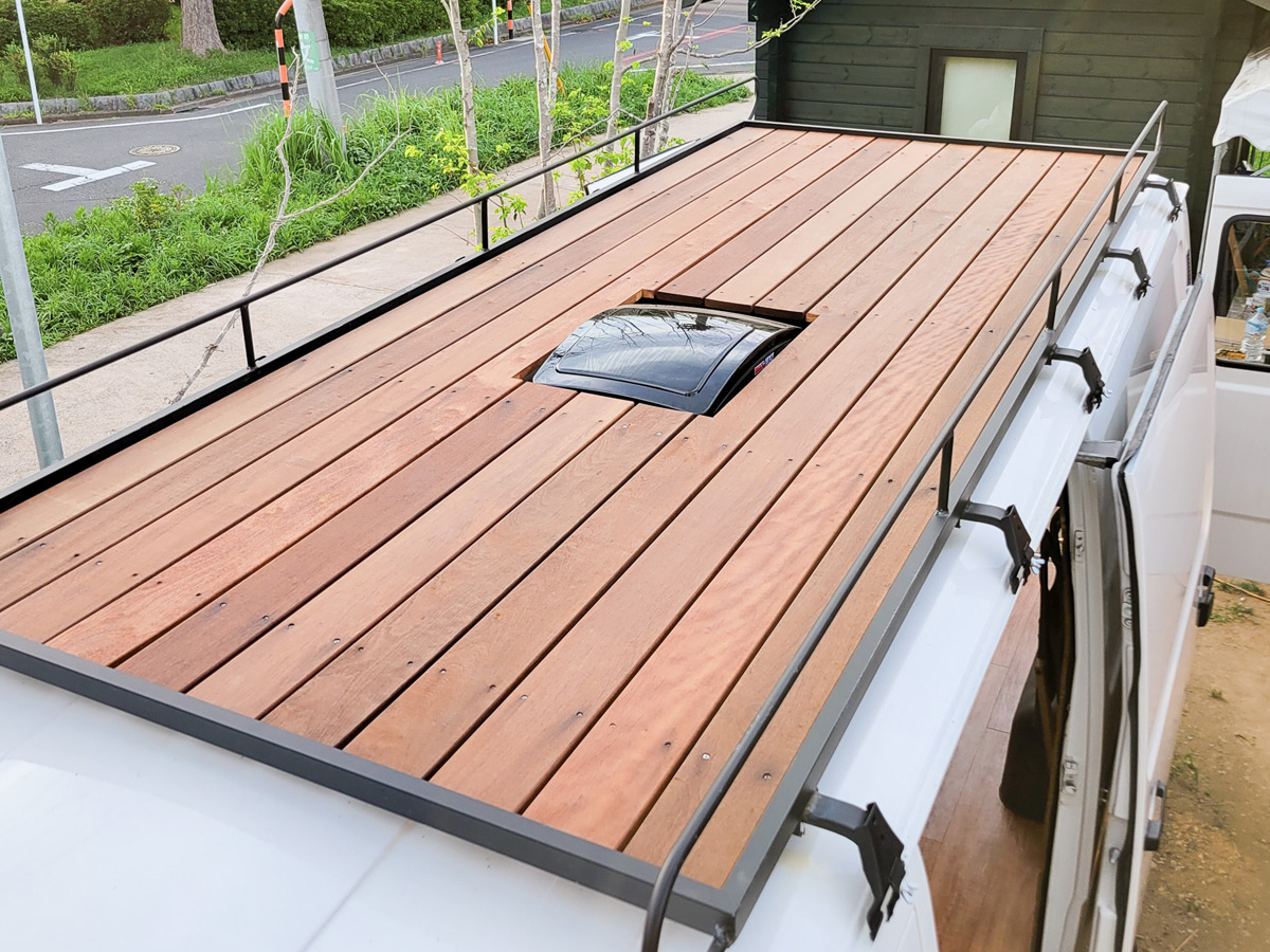 バンの車上は木製のルーフバルコニーになっていて、そこにテントを貼ることもできる。