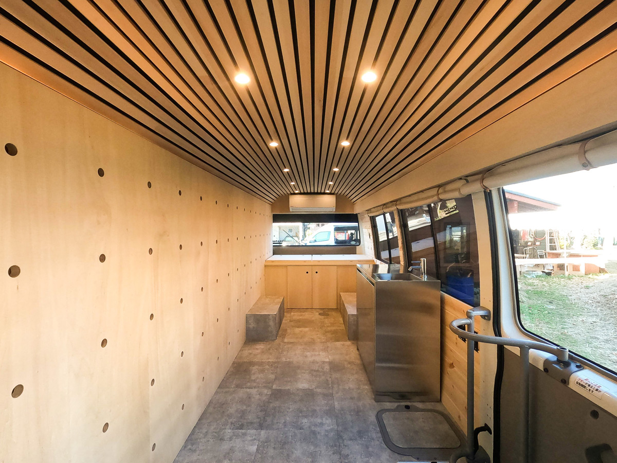 「今までは大きくても小さくてもやることは変わらないだろうと思っていましたが、実際にこのスクールバスの内装を初めてみたら、全然違いましたね。壁板を張っていても、いつ終わるんだろうって(笑)。あと、木材が高騰しているので、材料費の面でも想定外で大変でした。」