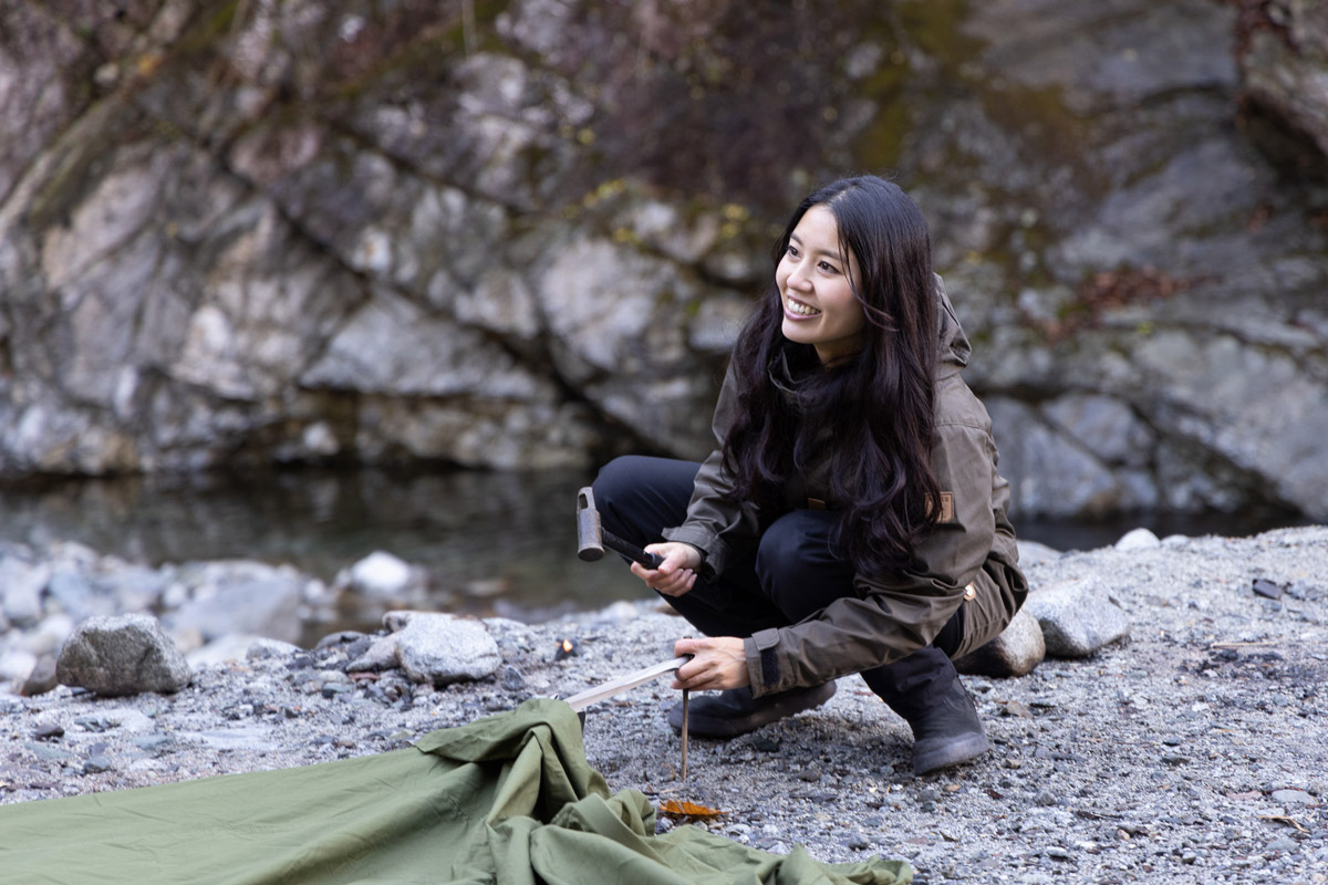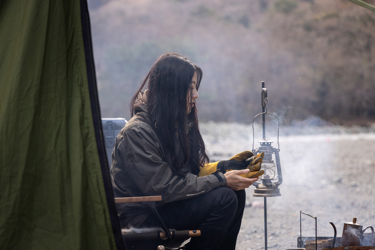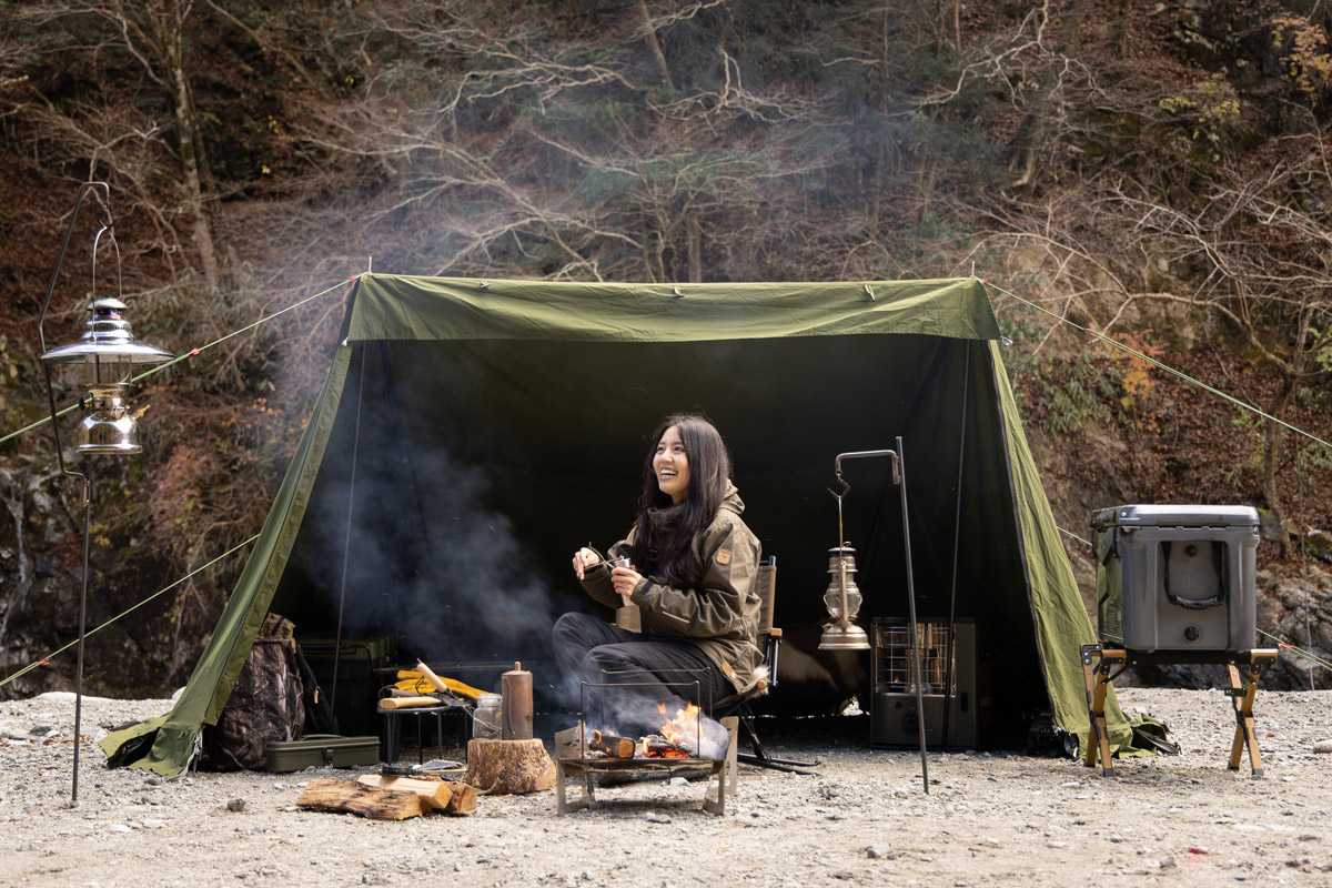 軍幕を愛用し、アイアンギアもうまく取り入れ、野営に近いスタンスでひっそりとキャンプを楽しむその姿は、男性顔負けだ。
