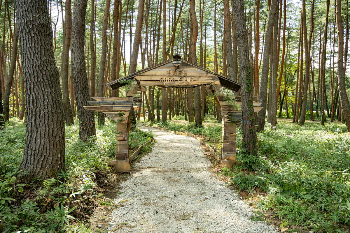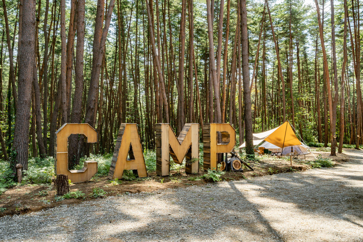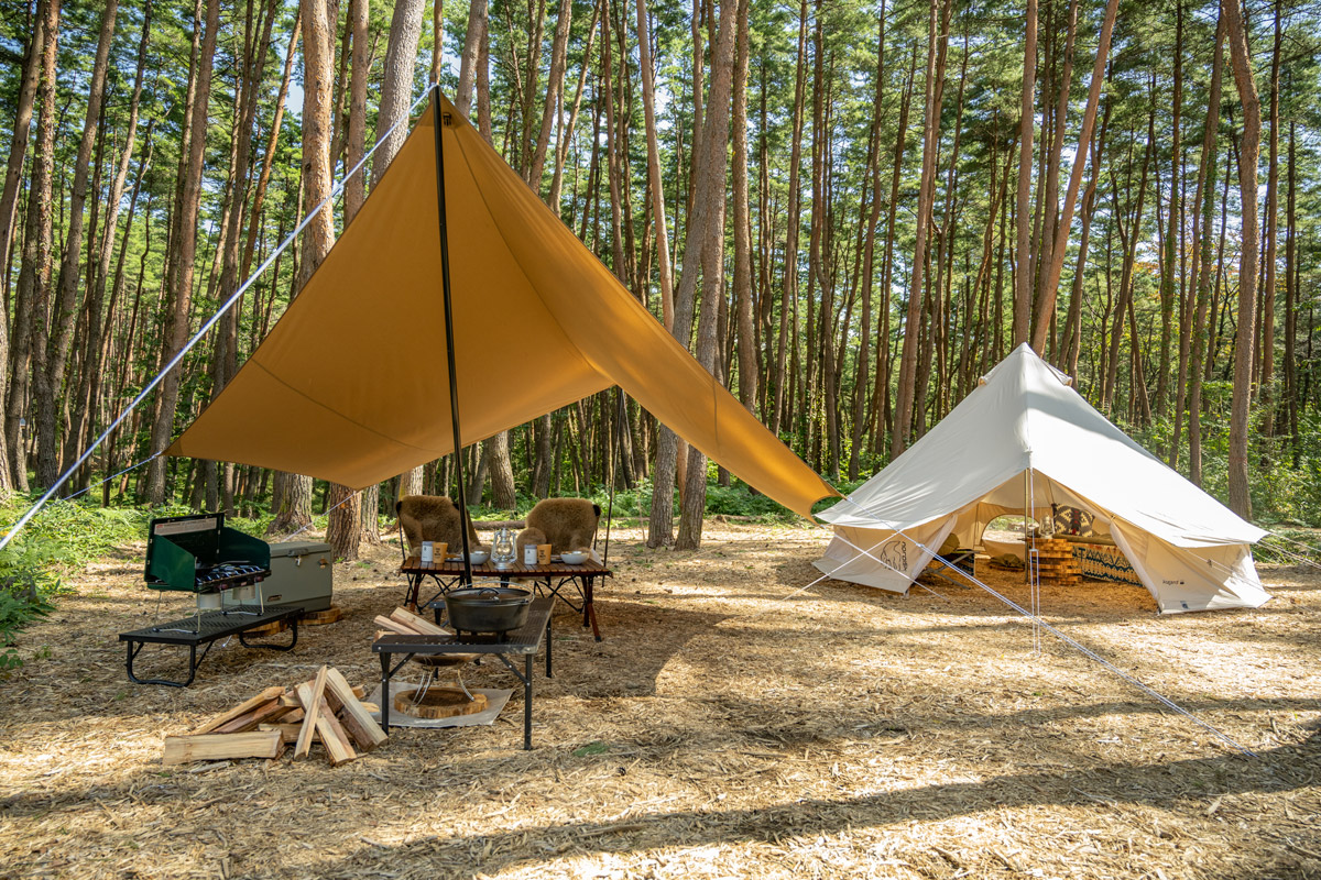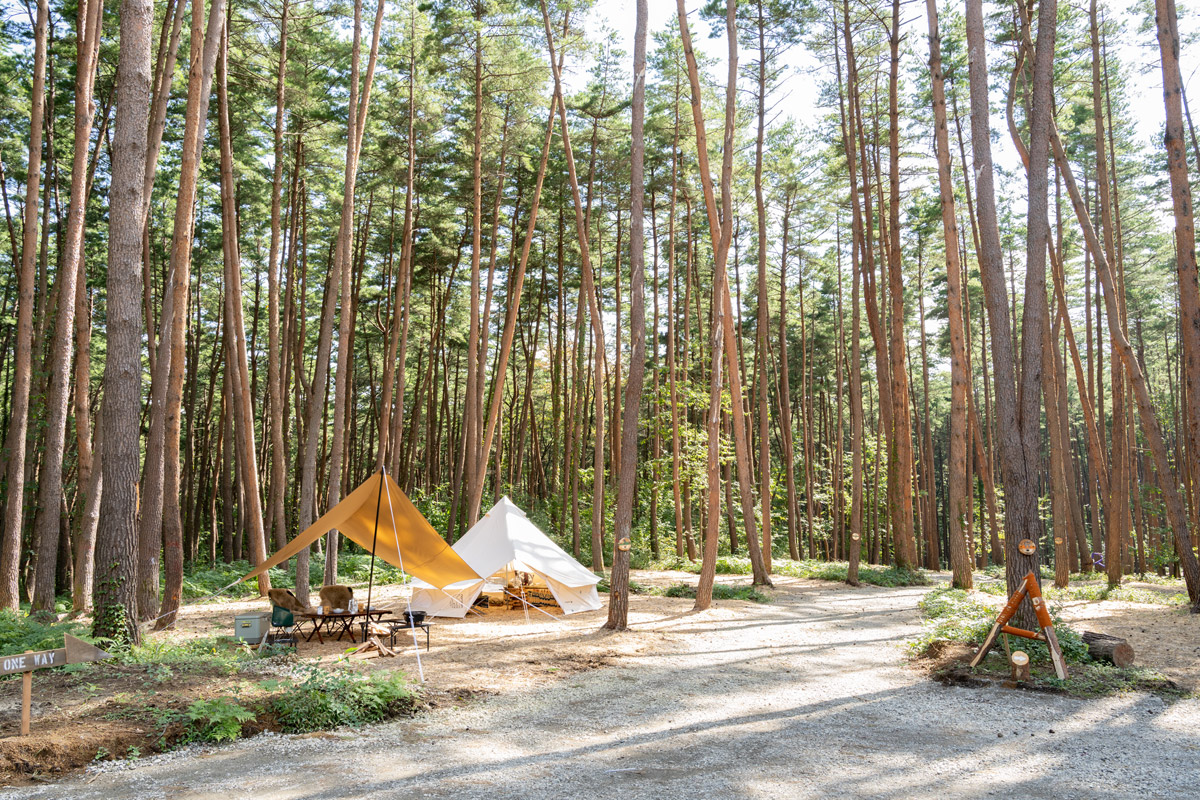 新旧の赤松に包まれたFOLKWOODのキャンプサイト