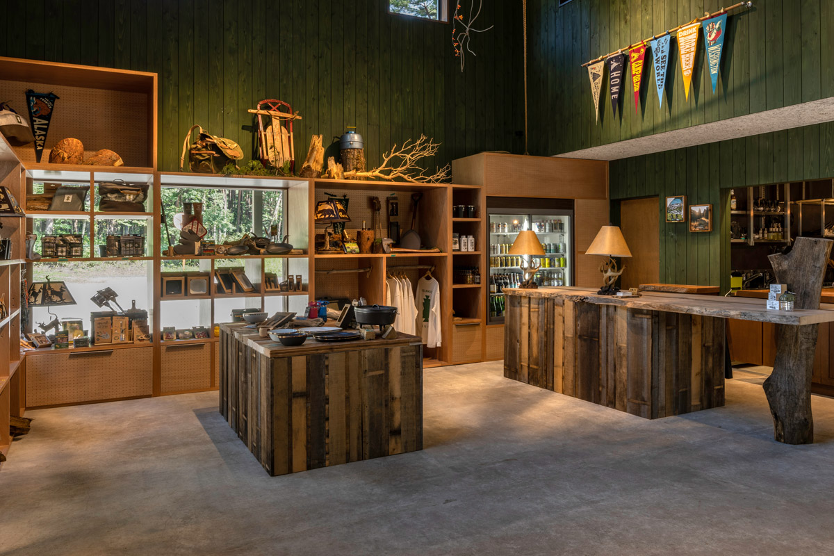 FOLKWOODの敷地に入るとまず目に入ってくる、FOLKWOODの象徴とも言えるセンターハウス。外観、内観ともにおしゃれで、管理棟、ショップ、カフェ、ワークスペース等がこのセンターハウスの中に入っている。