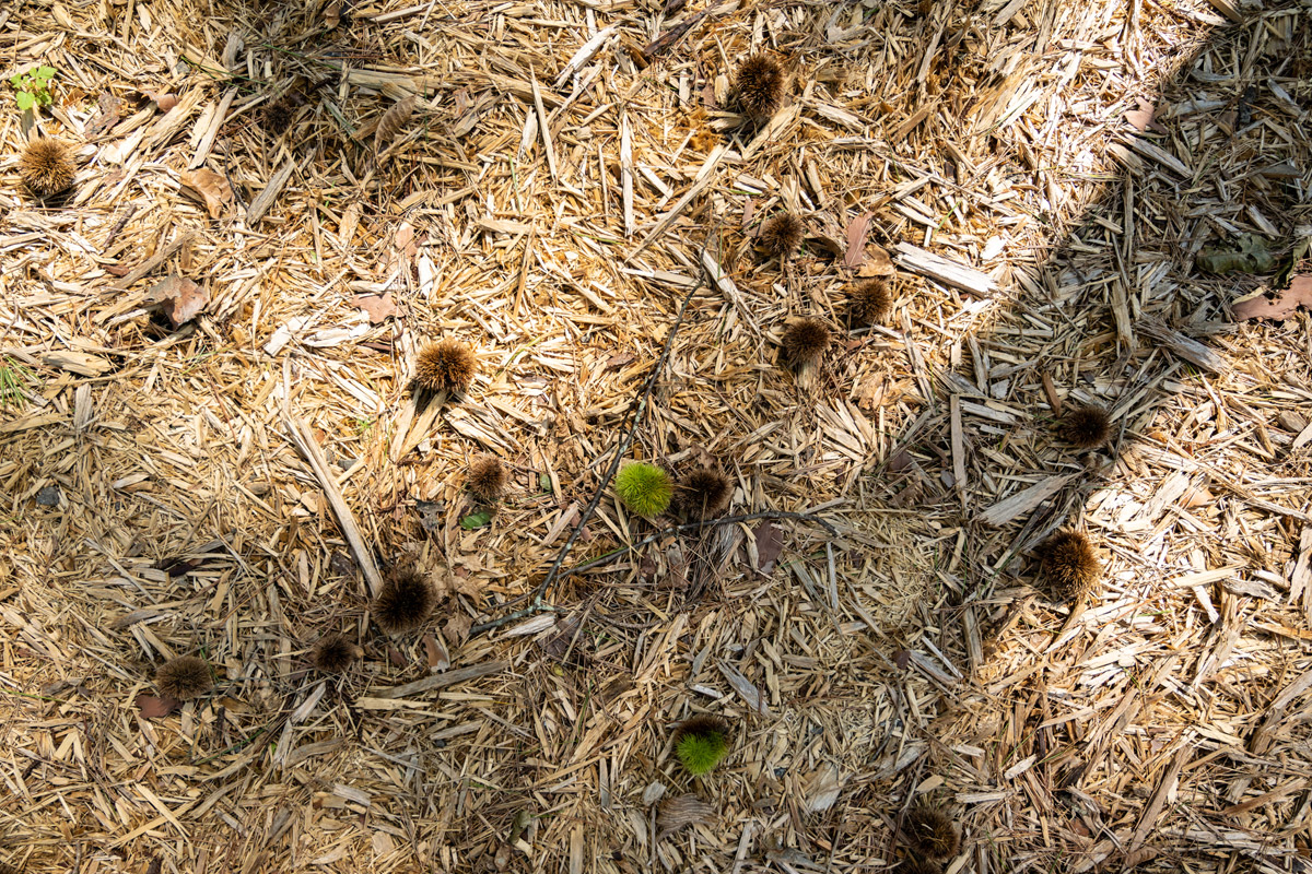 「実はこのウッドチップは、先ほど話した伐採した木を粉砕して、チップにして撒いたものなんです。生えている木も、敷いてあるチップも元々ここにあったもので囲まれているんですよね。」