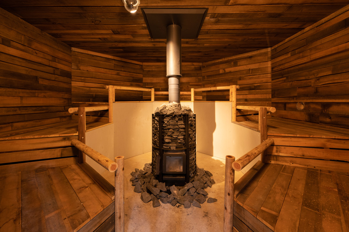 使われている薪ストーブは日本ではまだまだ珍しい、サウナの本場フィンランドから取り寄せたものが使われている。