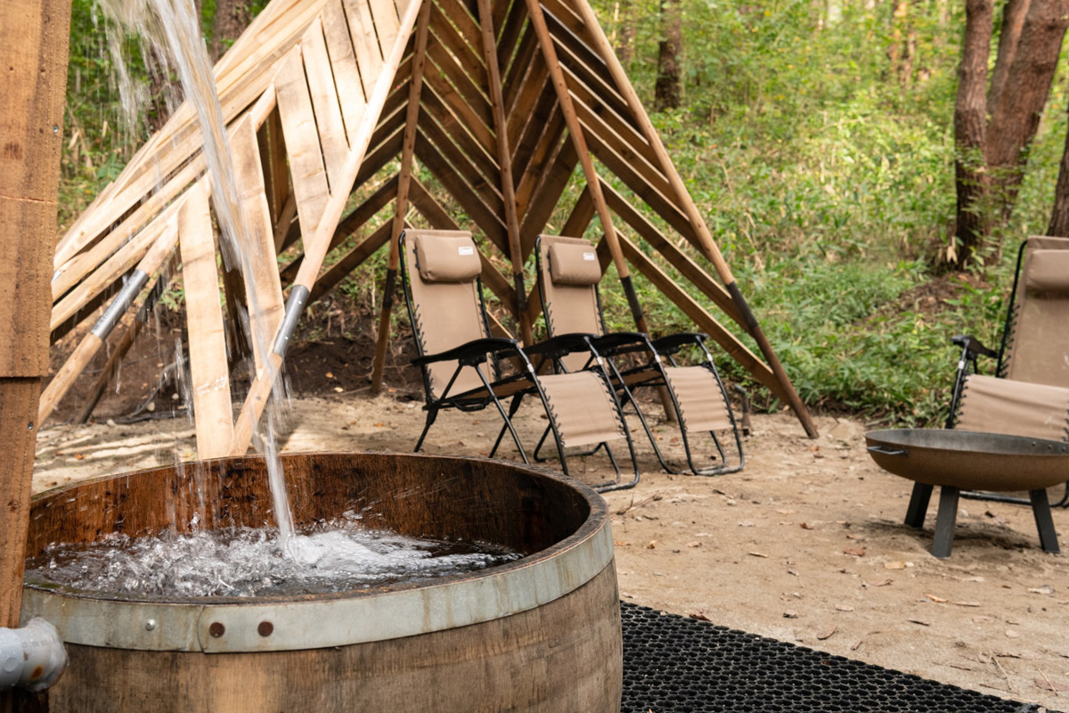 サウナエリアにはティピ型の薪火アウトドアサウナやファイヤープレイスが点在し、焚火を囲んでの外気浴なども楽しむことができる。