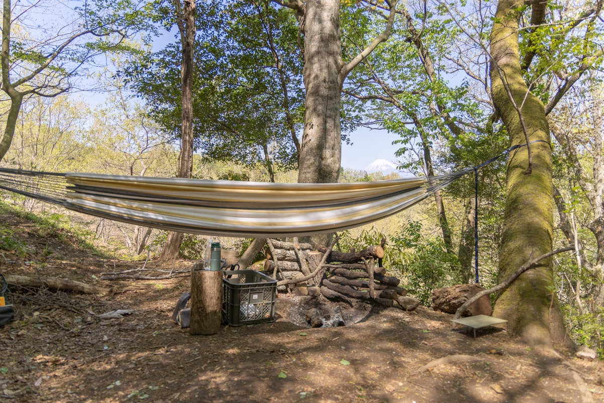 サイトは大きく分けて4つ。敷地の入り口付近にある、管理棟や簡易トイレが近い「East Valley」サイト。南側斜面に段々にサイトが設けられた、富士見サイトを有する「Hillside」サイト。北側の場内の砂利の坂道を登っていった先にある「North Hill」サイト。ジムニーなどの小型の四駆車でないと横付けは難しいが周囲を木々に囲まれたブッシュクラフトを存分に楽しむことができる「Bush Site」だ。