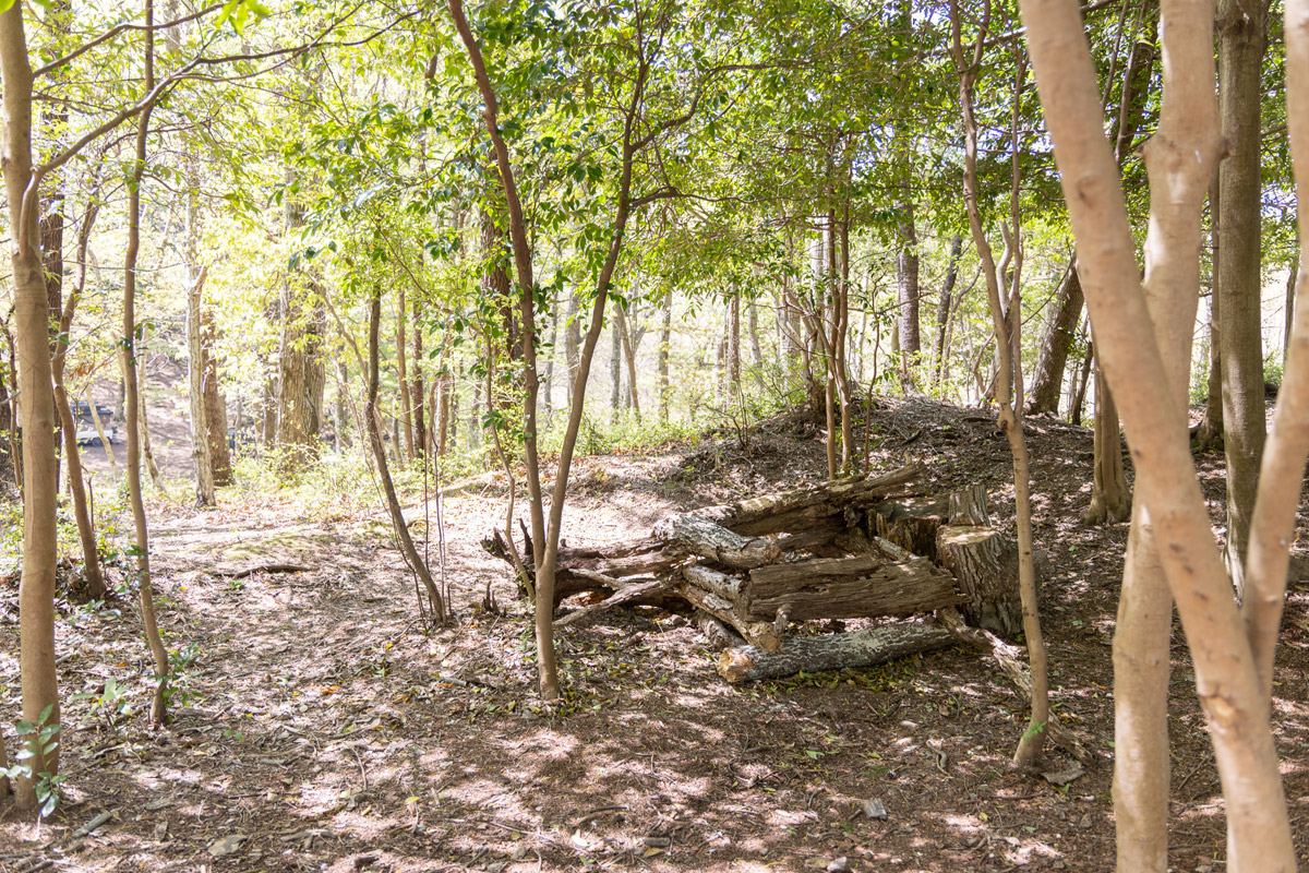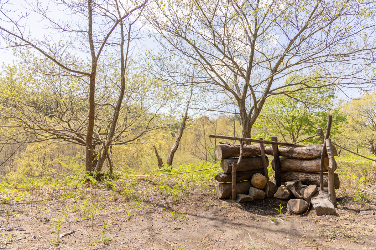 CAMP BEANの魅力はなんといっても、敷地内に豊富にある自然の木材を使ったブッシュクラフトが挙げられるだろう。前のキャンパーが作っていった風防やファイヤーピットが残されていることも多く、それらをそのまま使うことも可能だ。
