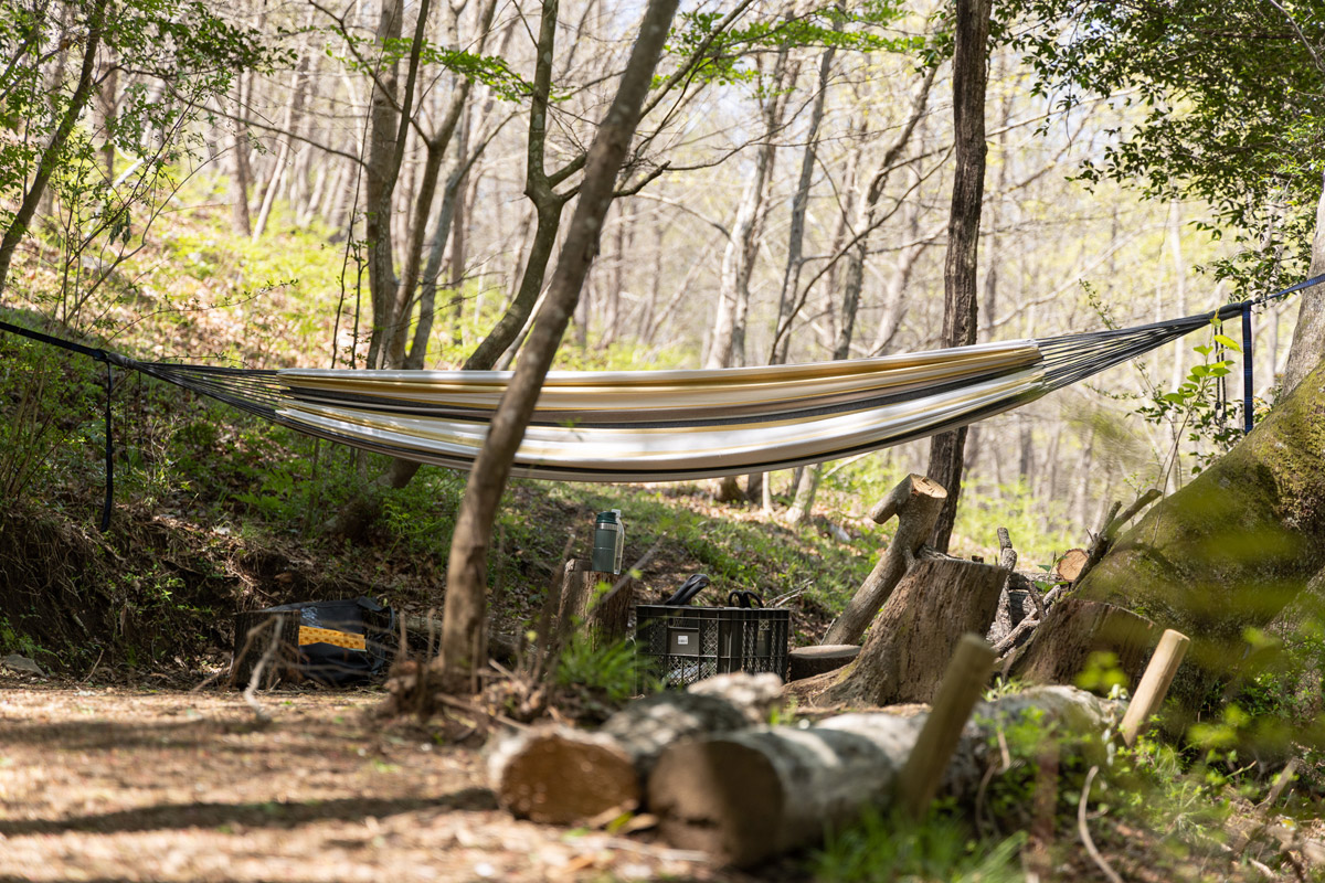 上のエリアにプラスして、リピーター向けに設けられた大きなヒメシャラの木がある広めな「ヒメシャラ」サイト。春になると眼前に綺麗なヤマザクラが咲く「ヤマザクラ」サイト。より深いブッシュクラフトを楽しみたい人向けの「Bushcraft Area」などがあり、それぞれ表情の違ったサイトがCAMP BEANを構成している。